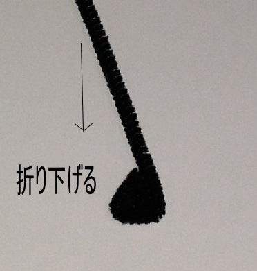 ⑨黒の3mmモールの端を5mmほど斜めに折り、そして長い方をまた斜めに折り、三角を作る。そのまま 三角に折り続け1辺が6~7mmの三角になったら余りを切り落とし3つの角を親指と人差し指でキュッと つまんで尖がらせる。これを2つ作る。(目)